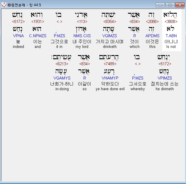 히브리어구약BHS,5 הֲלֹוא זֶה אֲשֶׁר יִשְׁתֶּה אֲדֹנִי בֹּו וְהוּא נַחֵשׁ יְנַחֵשׁ בֹּו הֲרֵעֹתֶם אֲשֶׁר עֲשִׂיתֶם׃