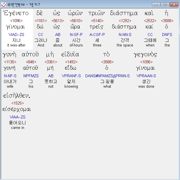헬라어신약Stephanos,7 εγενετο δε ως ωρων τριων διαστημα και η γυνη αυτου μη ειδυια το γεγονος εισηλθεν