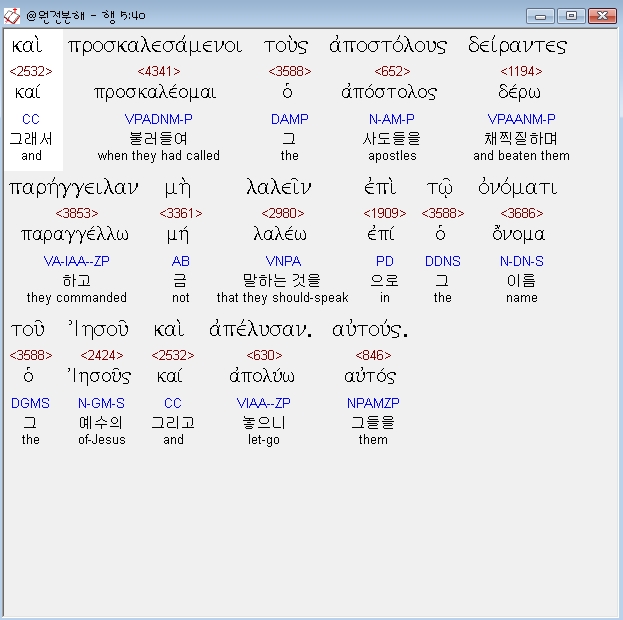 헬라어신약Stephanos,40 επεισθησαν δε αυτω και προσκαλεσαμενοι τους αποστολους δειραντες παρηγγειλαν μη λαλειν επι τω ονοματι του ιησου και απελυσαν αυτους