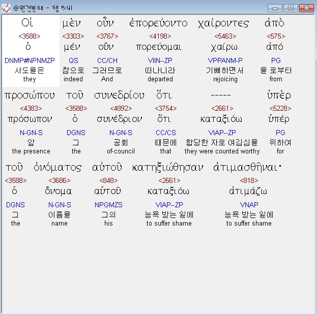 헬라어신약Stephanos,41 οι μεν ουν επορευοντο χαιροντες απο προσωπου του συνεδριου οτι υπερ του ονοματος αυτου κατηξιωθησαν ατιμασθηναι