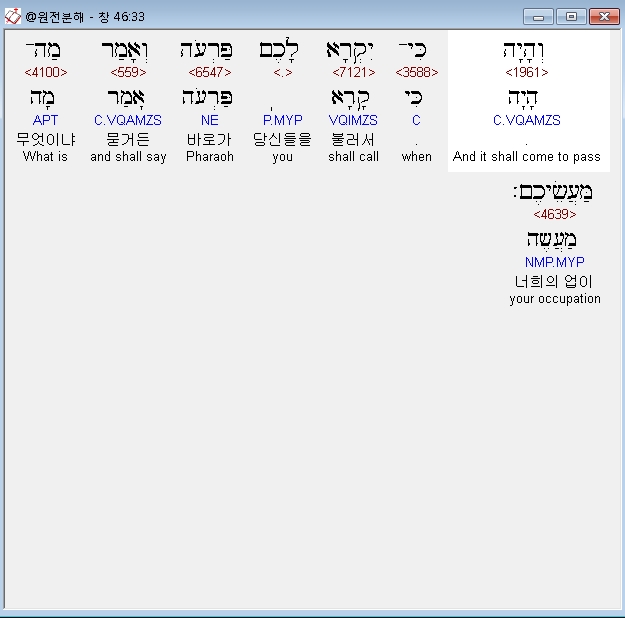 히브리어구약BHS,33 וְהָיָה כִּי־יִקְרָא לָכֶם פַּרְעֹה וְאָמַר מַה־מַּעֲשֵׂיכֶם׃
