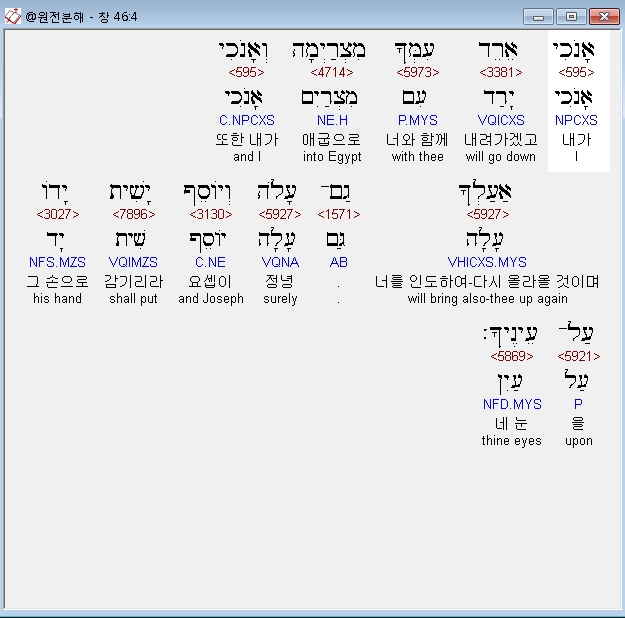 히브리어구약BHS,4 אָנֹכִי אֵרֵד עִמְּךָ מִצְרַיְמָה וְאָנֹכִי אַעַלְךָ גַם־עָלֹה וְיֹוסֵף יָשִׁית יָדֹו עַל־עֵינֶיךָ׃