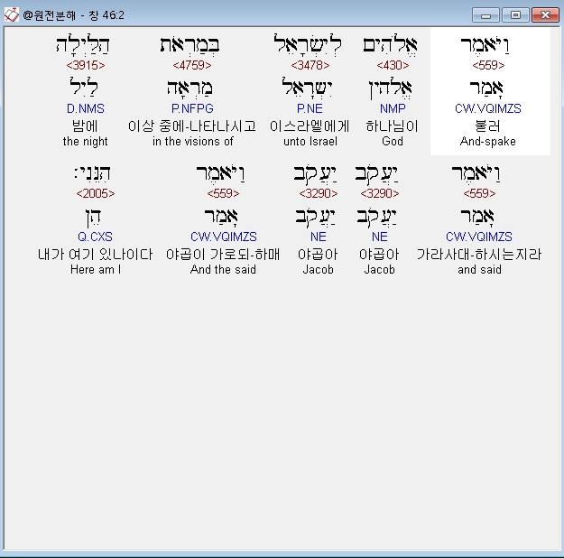 히브리어구약BHS,2 וַיֹּאמֶר אֱלֹהִים לְיִשְׂרָאֵל בְּמַרְאֹת הַלַּיְלָה וַיֹּאמֶר יַעֲקֹב יַעֲקֹב וַיֹּאמֶר הִנֵּנִי׃