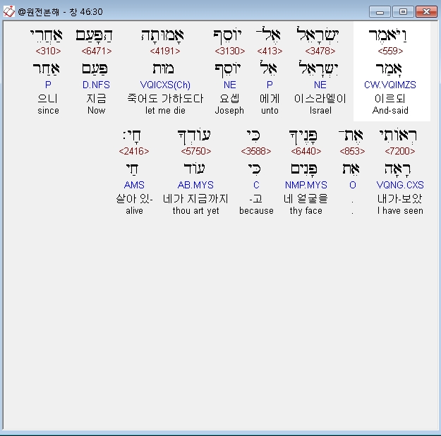 히브리어구약BHS,30 וַיֹּאמֶר יִשְׂרָאֵל אֶל־יֹוסֵף אָמוּתָה הַפָּעַם אַחֲרֵי רְאֹותִי אֶת־פָּנֶיךָ כִּי עֹודְךָ חָי׃