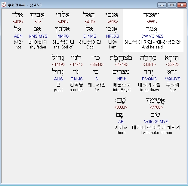 히브리어구약BHS,3 וַיֹּאמֶר אָנֹכִי הָאֵל אֱלֹהֵי אָבִיךָ אַל־תִּירָא מֵרְדָה מִצְרַיְמָה כִּי־לְגֹוי גָּדֹול אֲשִׂימְךָ שָׁם׃