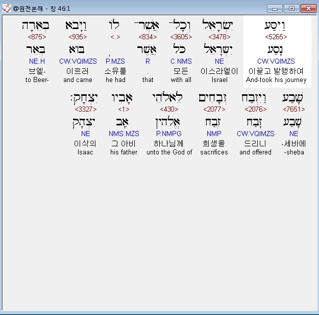 히브리어구약BHS,1 וַיִּסַּע יִשְׂרָאֵל וְכָל־אֲשֶׁר־לֹו וַיָּבֹא בְּאֵרָה שָּׁבַע וַיִּזְבַּח זְבָחִים לֵאלֹהֵי אָבִיו יִצְחָק׃