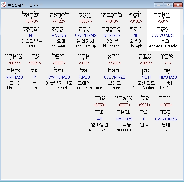 히브리어구약BHS,29 וַיֶּאְסֹר יֹוסֵף מֶרְכַּבְתֹּו וַיַּעַל לִקְרַאת־יִשְׂרָאֵל אָבִיו גֹּשְׁנָה וַיֵּרָא אֵלָיו וַיִּפֹּל עַל־צַוָּארָיו וַיֵּבְךְּ עַל־צַוָּארָיו עֹוד׃