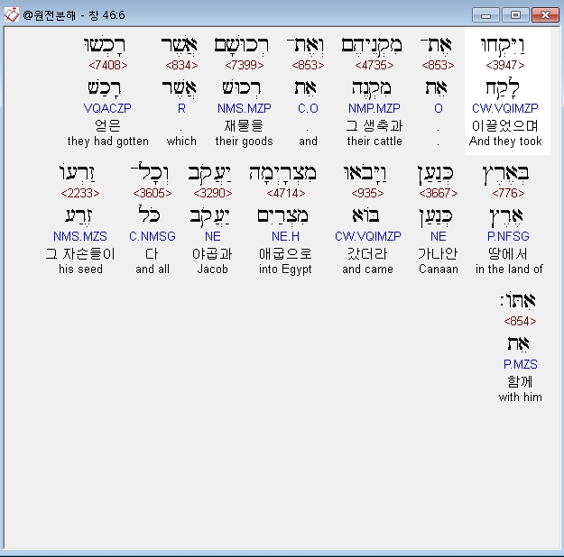 히브리어구약BHS,6 וַיִּקְחוּ אֶת־מִקְנֵיהֶם וְאֶת־רְכוּשָׁם אֲשֶׁר רָכְשׁוּ בְּאֶרֶץ כְּנַעַן וַיָּבֹאוּ מִצְרָיְמָה יַעֲקֹב וְכָל־זַרְעֹו אִתֹּו׃
