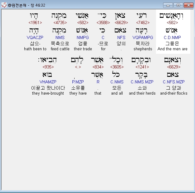 히브리어구약BHS,32 וְהָאֲנָשִׁים רֹעֵי צֹאן כִּי־אַנְשֵׁי מִקְנֶה הָיוּ וְצֹאנָם וּבְקָרָם וְכָל־אֲשֶׁר לָהֶם הֵבִיאוּ׃