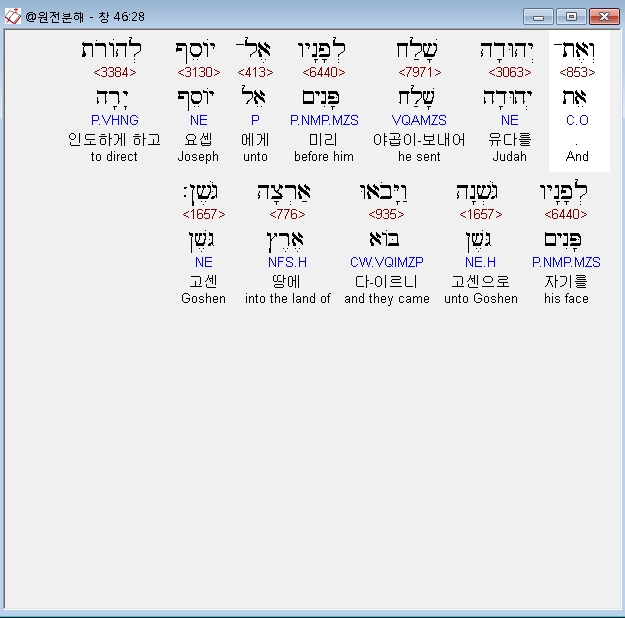 히브리어구약BHS,28 וְאֶת־יְהוּדָה שָׁלַח לְפָנָיו אֶל־יֹוסֵף לְהֹורֹת לְפָנָיו גֹּשְׁנָה וַיָּבֹאוּ אַרְצָה גֹּשֶׁן׃