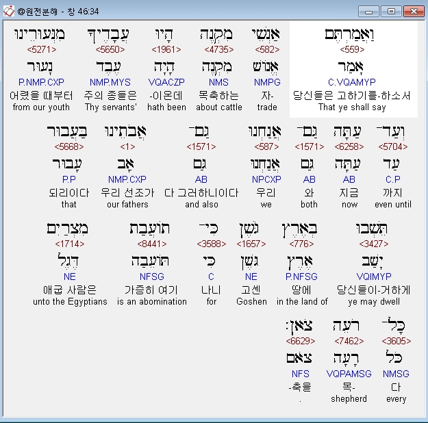 히브리어구약BHS,34 וַאֲמַרְתֶּם אַנְשֵׁי מִקְנֶה הָיוּ עֲבָדֶיךָ מִנְּעוּרֵינוּ וְעַד־עַתָּה גַּם־אֲנַחְנוּ גַּם־אֲבֹתֵינוּ בַּעֲבוּר תֵּשְׁבוּ בְּאֶרֶץ גֹּשֶׁן כִּי־תֹועֲבַת מִצְרַיִם כָּל־רֹעֵה צֹאן׃