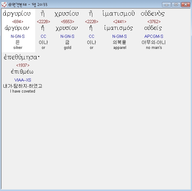 헬라어신약Stephanos,33 αργυριου η χρυσιου η ιματισμου ουδενος επεθυμησα