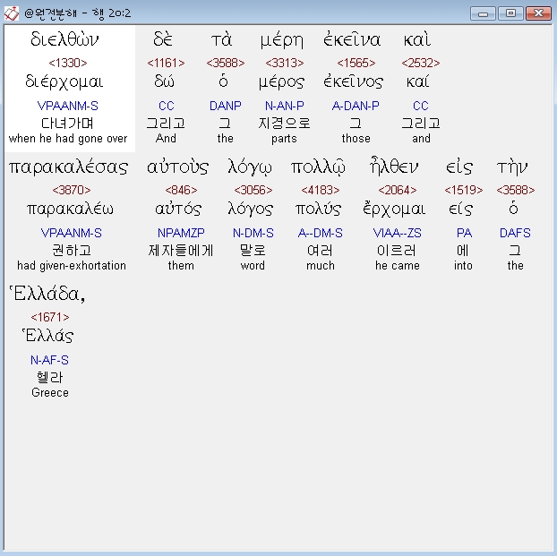 헬라어신약Stephanos,2 διελθων δε τα μερη εκεινα και παρακαλεσας αυτους λογω πολλω ηλθεν εις την ελλαδα