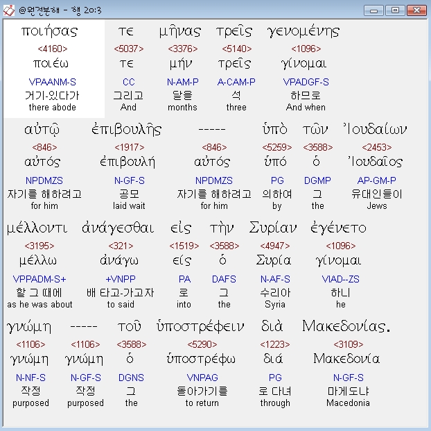 헬라어신약Stephanos,3 ποιησας τε μηνας τρεις γενομενης αυτω επιβουλης υπο των ιουδαιων μελλοντι αναγεσθαι εις την συριαν εγενετο γνωμη του υποστρεφειν δια μακεδονιας