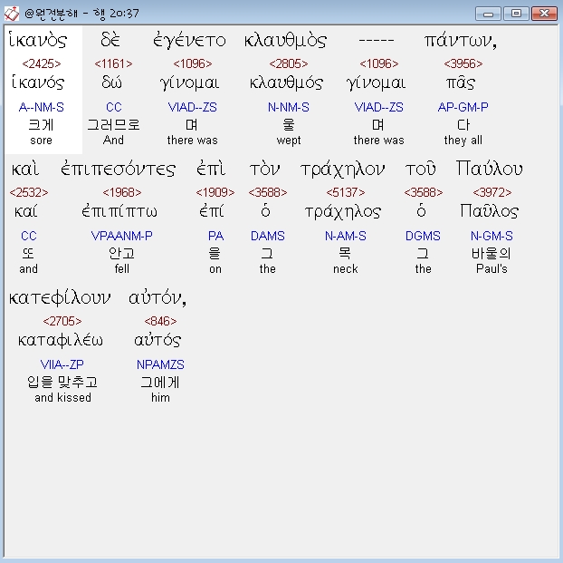 헬라어신약Stephanos,37 ικανος δε εγενετο κλαυθμος παντων και επιπεσοντες επι τον τραχηλον του παυλου κατεφιλουν αυτον