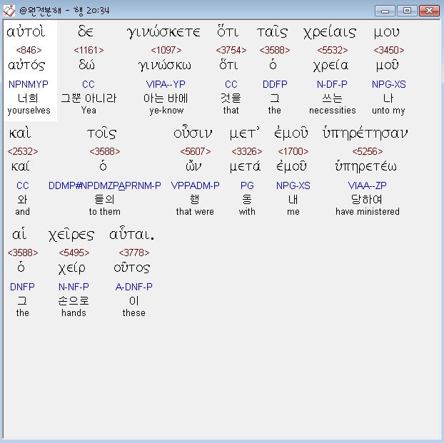 헬라어신약Stephanos,34 αυτοι δε γινωσκετε οτι ταις χρειαις μου και τοις ουσιν μετ εμου υπηρετησαν αι χειρες αυται