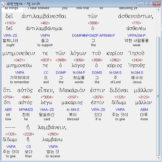헬라어신약Stephanos,35 παντα υπεδειξα υμιν οτι ουτως κοπιωντας δει αντιλαμβανεσθαι των ασθενουντων μνημονευειν τε των λογων του κυριου ιησου οτι αυτος ειπεν μακαριον εστιν διδοναι μαλλον η λαμβανειν