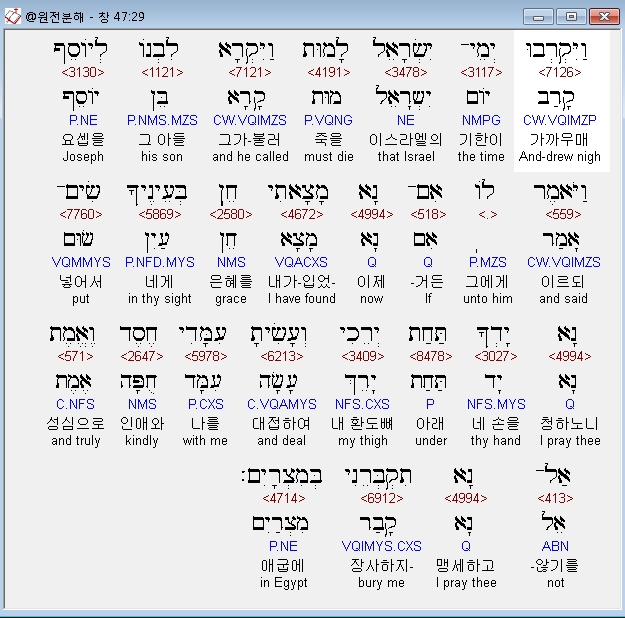 영어NASB,29 When the time for Israel to die drew near, he called his son Joseph and said to him, "Please, if I have found favor in your sight, place now your hand under my thigh and deal with me in kindness and faithfulness. Please do not bury me in Egypt,