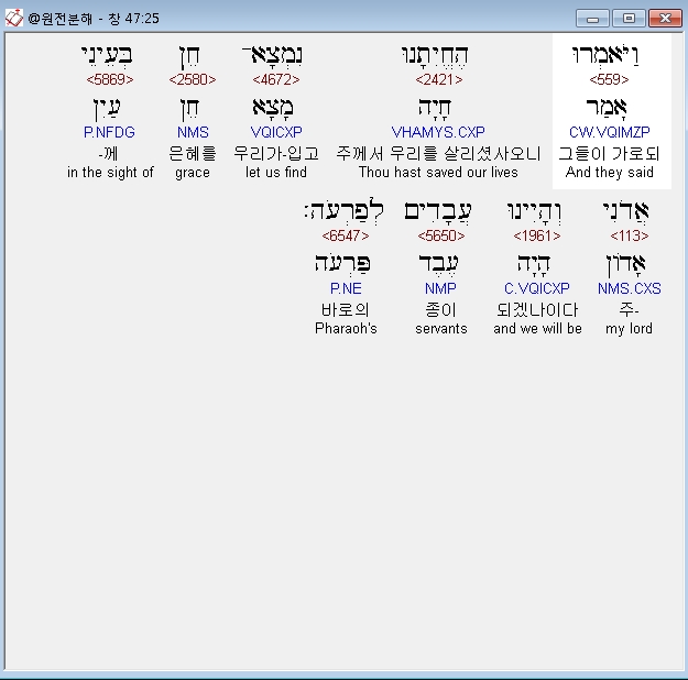 히브리어구약BHS,25 וַיֹּאמְרוּ הֶחֱיִתָנוּ נִמְצָא־חֵן בְּעֵינֵי אֲדֹנִי וְהָיִינוּ עֲבָדִים לְפַרְעֹה׃
