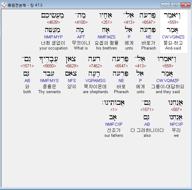 히브리어구약BHS,3 וַיֹּאמֶר פַּרְעֹה אֶל־אֶחָיו מַה־מַּעֲשֵׂיכֶם וַיֹּאמְרוּ אֶל־פַּרְעֹה רֹעֵה צֹאן עֲבָדֶיךָ גַּם־אֲנַחְנוּ גַּם־אֲבֹותֵינוּ׃