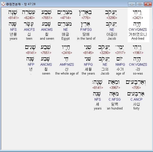 히브리어구약BHS,28 וַיְחִי יַעֲקֹב בְּאֶרֶץ מִצְרַיִם שְׁבַע עֶשְׂרֵה שָׁנָה וַיְהִי יְמֵי־יַעֲקֹב שְׁנֵי חַיָּיו שֶׁבַע שָׁנִים וְאַרְבָּעִים וּמְאַת שָׁנָה׃