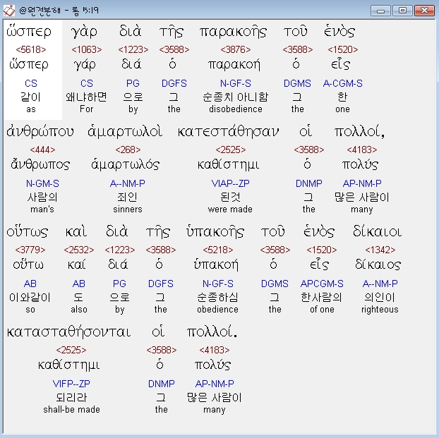 헬라어신약Stephanos,19 ωσπερ γαρ δια της παρακοης του ενος ανθρωπου αμαρτωλοι κατεσταθησαν οι πολλοι ουτως και δια της υπακοης του ενος δικαιοι κατασταθησονται οι πολλοι