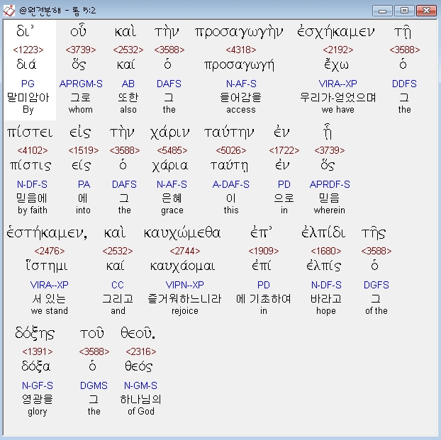 헬라어신약Stephanos,2 δι ου και την προσαγωγην εσχηκαμεν τη πιστει εις την χαριν ταυτην εν η εστηκαμεν και καυχωμεθα επ ελπιδι της δοξης του θεου