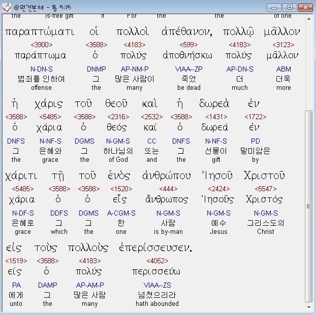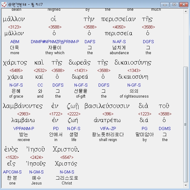 헬라어신약Stephanos,17 ει γαρ τω του ενος παραπτωματι ο θανατος εβασιλευσεν δια του ενος πολλω μαλλον οι την περισσειαν της χαριτος και της δωρεας της δικαιοσυνης λαμβανοντες εν ζωη βασιλευσουσιν δια του ενος ιησου χριστου