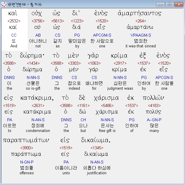 헬라어신약Stephanos,16 και ουχ ως δι ενος αμαρτησαντος το δωρημα το μεν γαρ κριμα εξ ενος εις κατακριμα το δε χαρισμα εκ πολλων παραπτωματων εις δικαιωμα