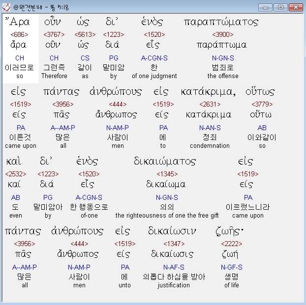 헬라어신약Stephanos,18 αρα ουν ως δι ενος παραπτωματος εις παντας ανθρωπους εις κατακριμα ουτως και δι ενος δικαιωματος εις παντας ανθρωπους εις δικαιωσιν ζωης