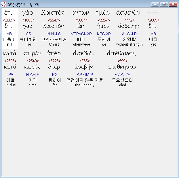 헬라어신약Stephanos,6 ετι γαρ χριστος οντων ημων ασθενων κατα καιρον υπερ ασεβων απεθανεν