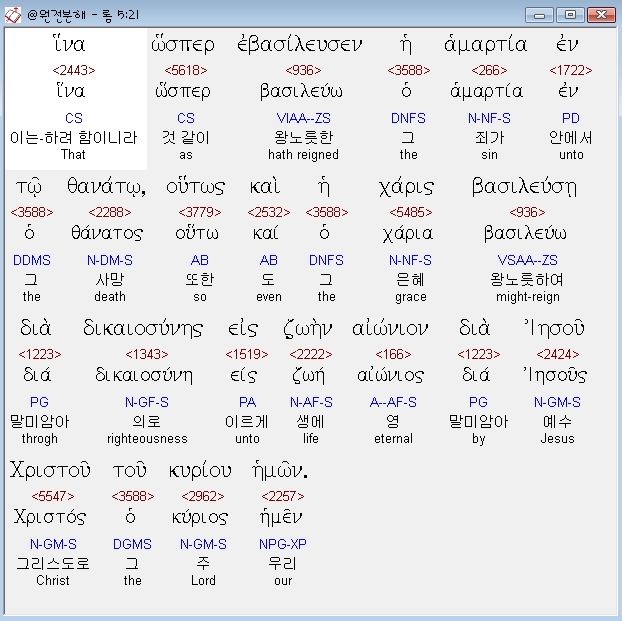 히나 호스페르 에바실류센 헤 하마르티아 엔 토 다나토 후토스 카이 헤 카리스 바실류세 디아 디카이오쉬네스 에이스 조엔 아이오니온 디아 예수 크리스투 투 퀴리우 헤몬