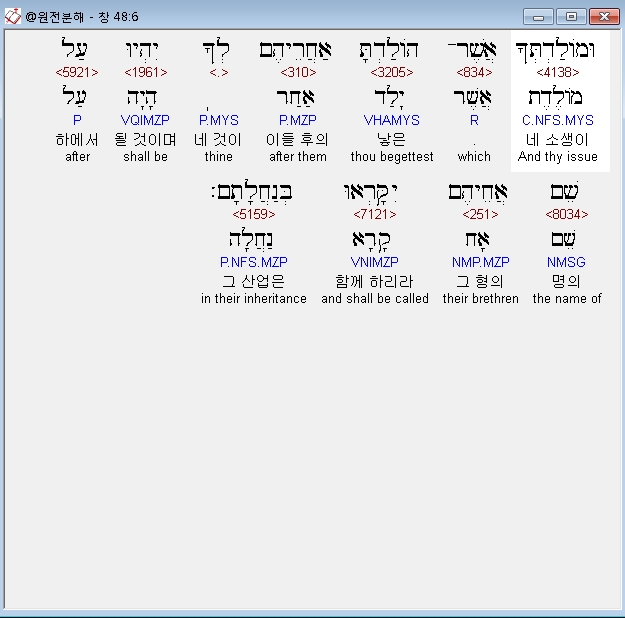 히브리어구약BHS,6 וּמֹולַדְתְּךָ אֲשֶׁר־הֹולַדְתָּ אַחֲרֵיהֶם לְךָ יִהְיוּ עַל שֵׁם אֲחֵיהֶם יִקָּרְאוּ בְּנַחֲלָתָם׃