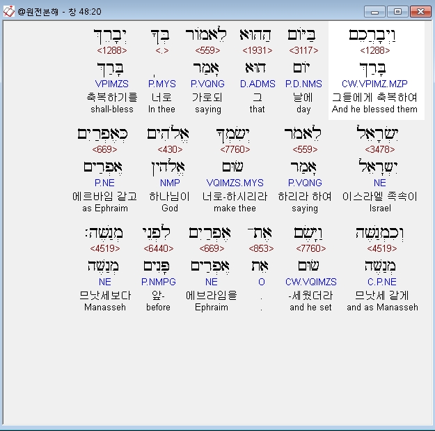히브리어구약BHS,20 וַיְבָרֲכֵם בַּיֹּום הַהוּא לֵאמֹור בְּךָ יְבָרֵךְ יִשְׂרָאֵל לֵאמֹר יְשִׂמְךָ אֱלֹהִים כְּאֶפְרַיִם וְכִמְנַשֶּׁה וַיָּשֶׂם אֶת־אֶפְרַיִם לִפְנֵי מְנַשֶּׁה׃
