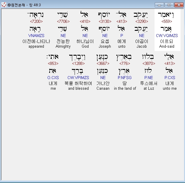 히브리어구약BHS,3 וַיֹּאמֶר יַעֲקֹב אֶל־יֹוסֵף אֵל שַׁדַּי נִרְאָה־אֵלַי בְּלוּז בְּאֶרֶץ כְּנָעַן וַיְבָרֶךְ אֹתִי׃
