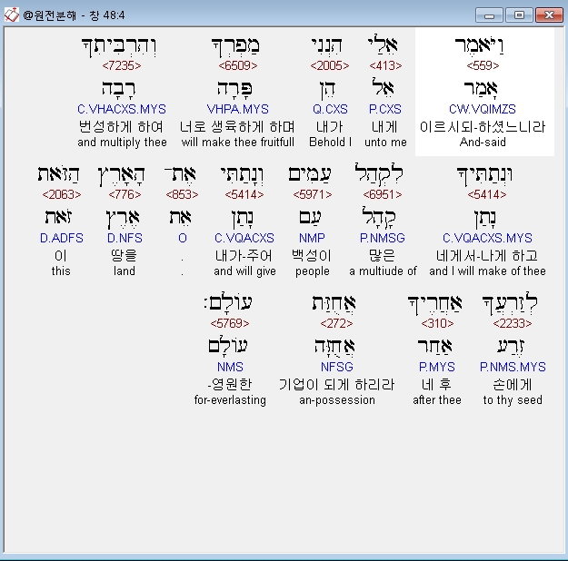 히브리어구약BHS,4 וַיֹּאמֶר אֵלַי הִנְנִי מַפְרְךָ וְהִרְבִּיתִךָ וּנְתַתִּיךָ לִקְהַל עַמִּים וְנָתַתִּי אֶת־הָאָרֶץ הַזֹּאת לְזַרְעֲךָ אַחֲרֶיךָ אֲחֻזַּת עֹולָם׃