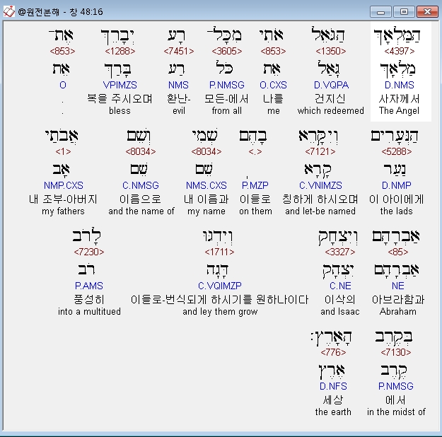 히브리어구약BHS,16 הַמַּלְאָךְ הַגֹּאֵל אֹתִי מִכָּל־רָע יְבָרֵךְ אֶת־הַנְּעָרִים וְיִקָּרֵא בָהֶם שְׁמִי וְשֵׁם אֲבֹתַי אַבְרָהָם וְיִצְחָק וְיִדְגּוּ לָרֹב בְּקֶרֶב הָאָרֶץ׃