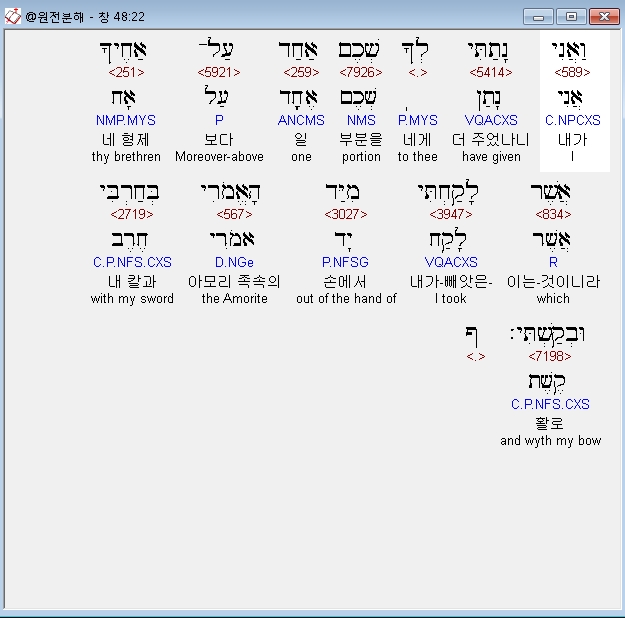 영어NASB,22 "And I give you one portion more than your brothers, which I took from the hand of the Amorite with my sword and my bow."