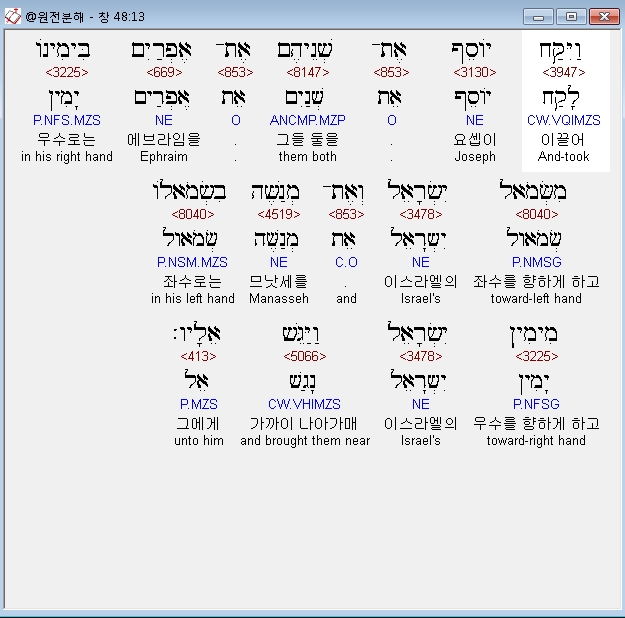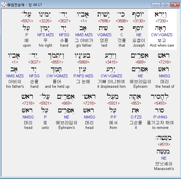 영어MSG,17 When Joseph saw that his father had placed his right hand on Ephraim's head, he thought he had made a mistake, so he took hold of his father's hand to move it from Ephraim's head to Manasseh's,
