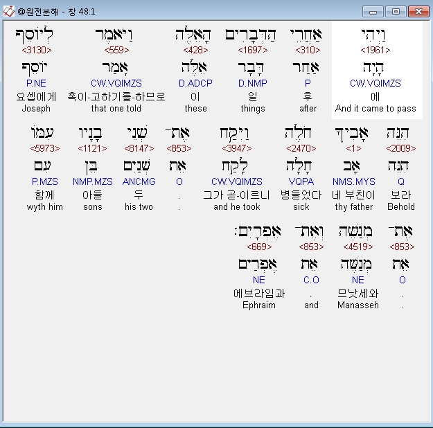히브리어구약BHS,1 וַיְהִי אַחֲרֵי הַדְּבָרִים הָאֵלֶּה וַיֹּאמֶר לְיֹוסֵף הִנֵּה אָבִיךָ חֹלֶה וַיִּקַּח אֶת־שְׁנֵי בָנָיו עִמֹּו אֶת־מְנַשֶּׁה וְאֶת־אֶפְרָיִם׃
