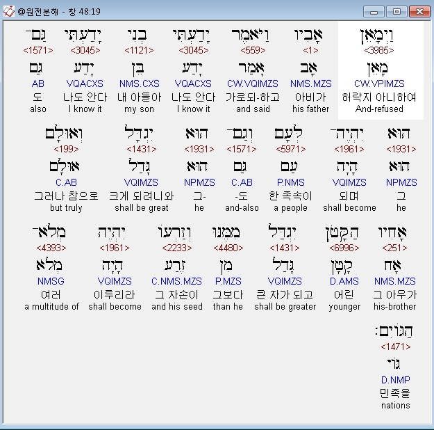 영어NASB,19 But his father refused and said, "I know, my son, I know; he also shall become a people and he also shall be great. However, his younger brother shall be greater than he, and his descendants shall become a multitude of nations."