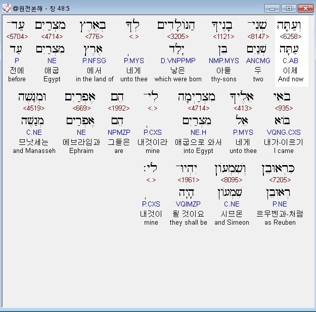 히브리어구약BHS,5 וְעַתָּה שְׁנֵי־בָנֶיךָ הַנֹּולָדִים לְךָ בְּאֶרֶץ מִצְרַיִם עַד־בֹּאִי אֵלֶיךָ מִצְרַיְמָה לִי־הֵם אֶפְרַיִם וּמְנַשֶּׁה כִּרְאוּבֵן וְשִׁמְעֹון יִהְיוּ־לִי׃