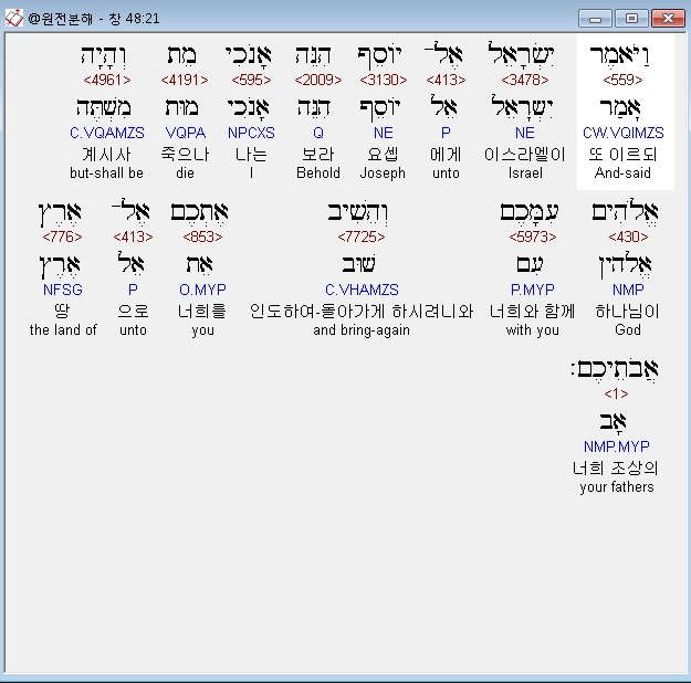 히브리어구약BHS,21 וַיֹּאמֶר יִשְׂרָאֵל אֶל־יֹוסֵף הִנֵּה אָנֹכִי מֵת וְהָיָה אֱלֹהִים עִםָּכֶם וְהֵשִׁיב אֶתְכֶם אֶל־אֶרֶץ אֲבֹתֵיכֶם׃