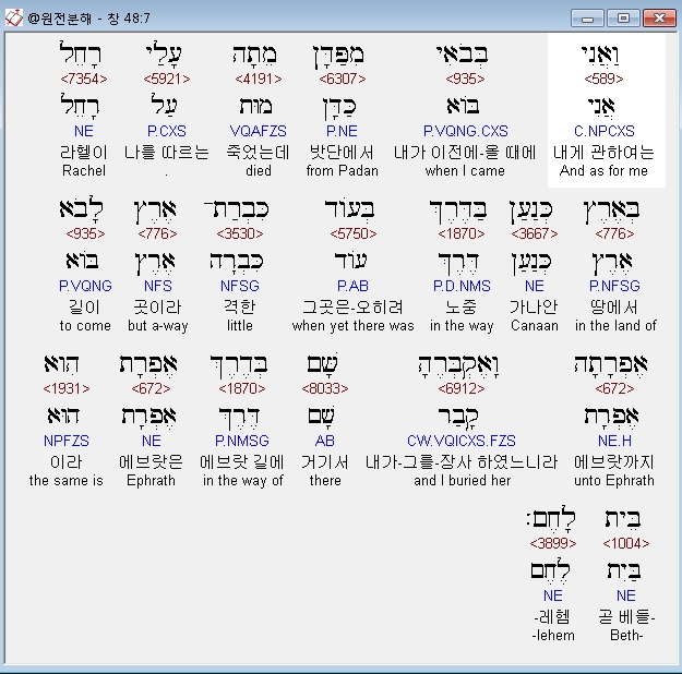 와아니 베보이 미파단 메타 알라이 라헬 베에레츠 케나안 바데렠 베오드 킵라트 에레츠 라보 에프라타 와에크베레하 솸 베데렠 에프라트 히 베이트 라헴