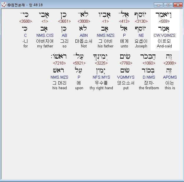 히브리어구약BHS,18 וַיֹּאמֶר יֹוסֵף אֶל־אָבִיו לֹא־כֵן אָבִי כִּי־זֶה הַבְּכֹר שִׂים יְמִינְךָ עַל־רֹאשֹׁו׃