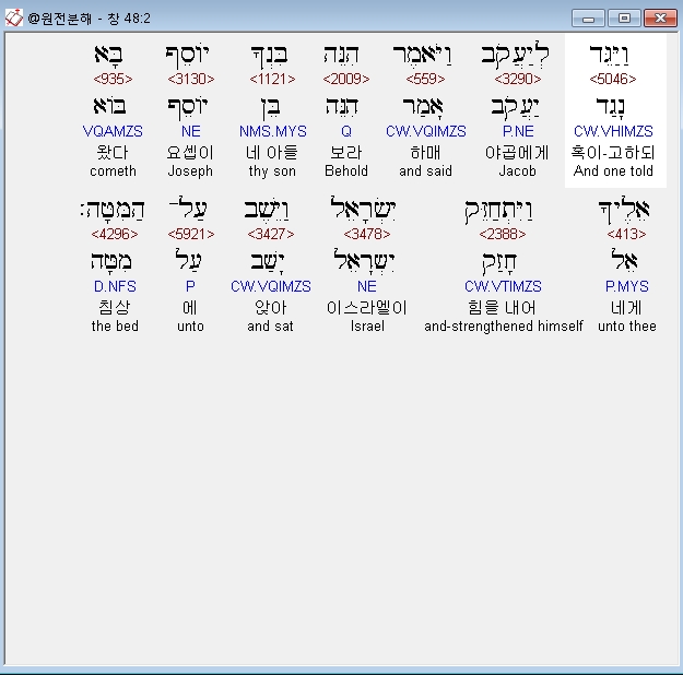 히브리어구약BHS,2 וַיַּגֵּד לְיַעֲקֹב וַיֹּאמֶר הִנֵּה בִּנְךָ יֹוסֵף בָּא אֵלֶיךָ וַיִּתְחַזֵּק יִשְׂרָאֵל וַיֵּשֶׁב עַל־הַמִּטָּה׃