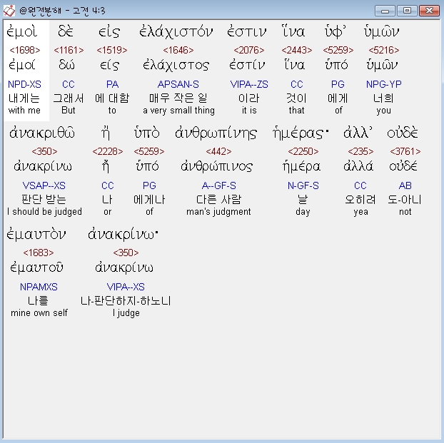헬라어신약Stephanos,3 εμοι δε εις ελαχιστον εστιν ινα υφ υμων ανακριθω η υπο ανθρωπινης ημερας αλλ ουδε εμαυτον ανακρινω