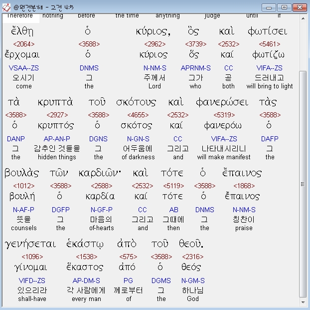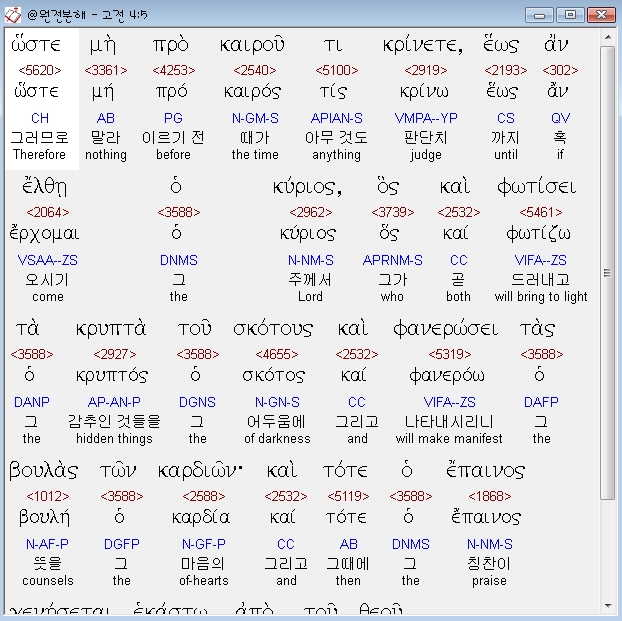 헬라어신약Stephanos,5 ωστε μη προ καιρου τι κρινετε εως αν ελθη ο κυριος ος και φωτισει τα κρυπτα του σκοτους και φανερωσει τας βουλας των καρδιων και τοτε ο επαινος γενησεται εκαστω απο του θεου