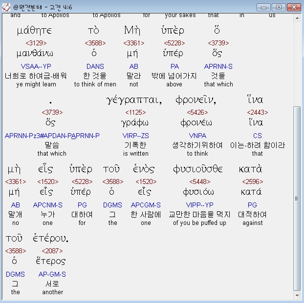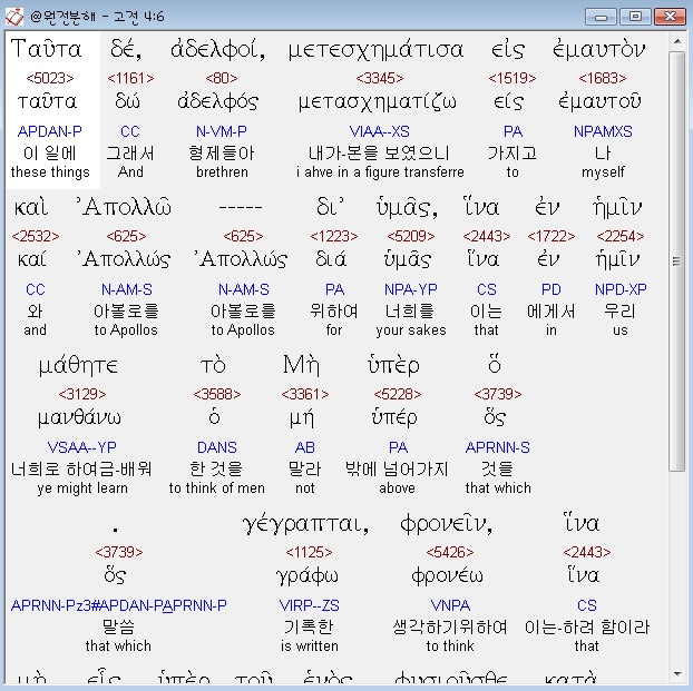 헬라어신약Stephanos,6 ταυτα δε αδελφοι μετεσχηματισα εις εμαυτον και απολλω δι υμας ινα εν ημιν μαθητε το μη υπερ ο γεγραπται φρονειν ινα μη εις υπερ του ενος φυσιουσθε κατα του ετερου