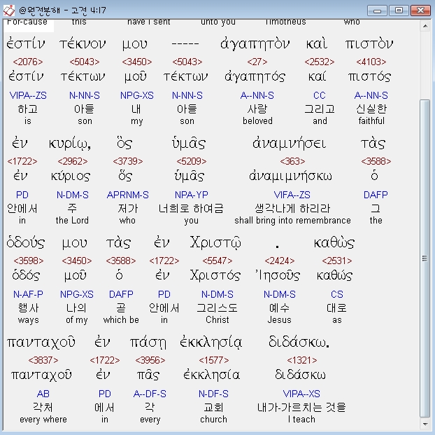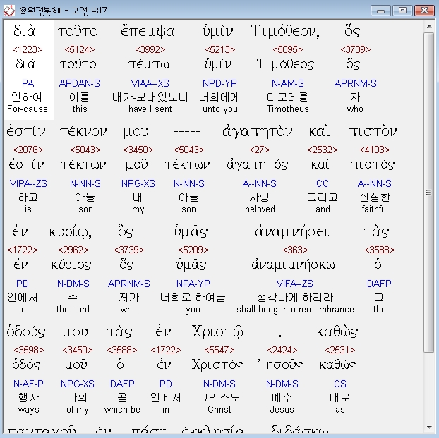 헬라어신약Stephanos,17 δια τουτο επεμψα υμιν τιμοθεον ος εστιν τεκνον μου αγαπητον και πιστον εν κυριω ος υμας αναμνησει τας οδους μου τας εν χριστω καθως πανταχου εν παση εκκλησια διδασκω